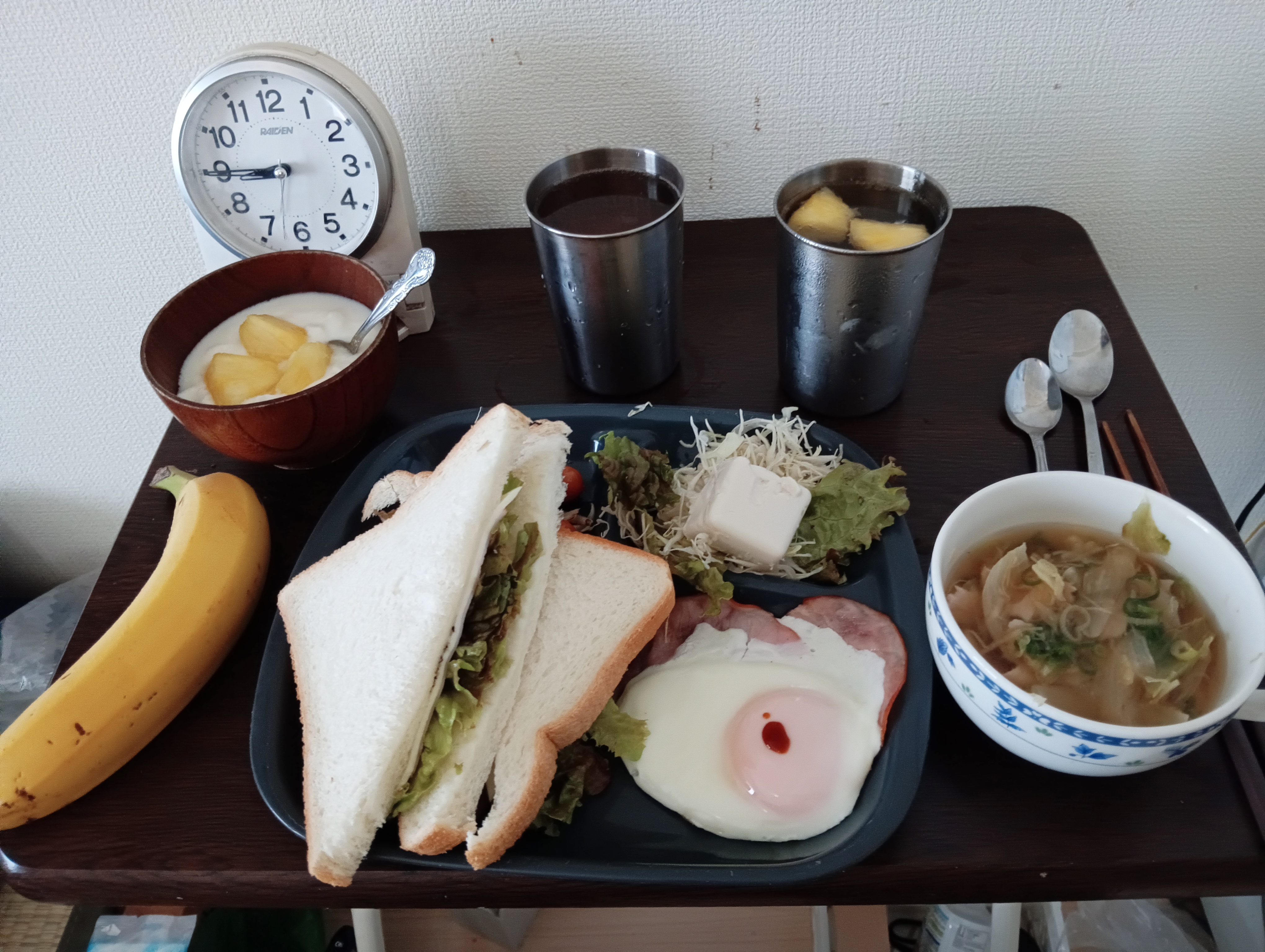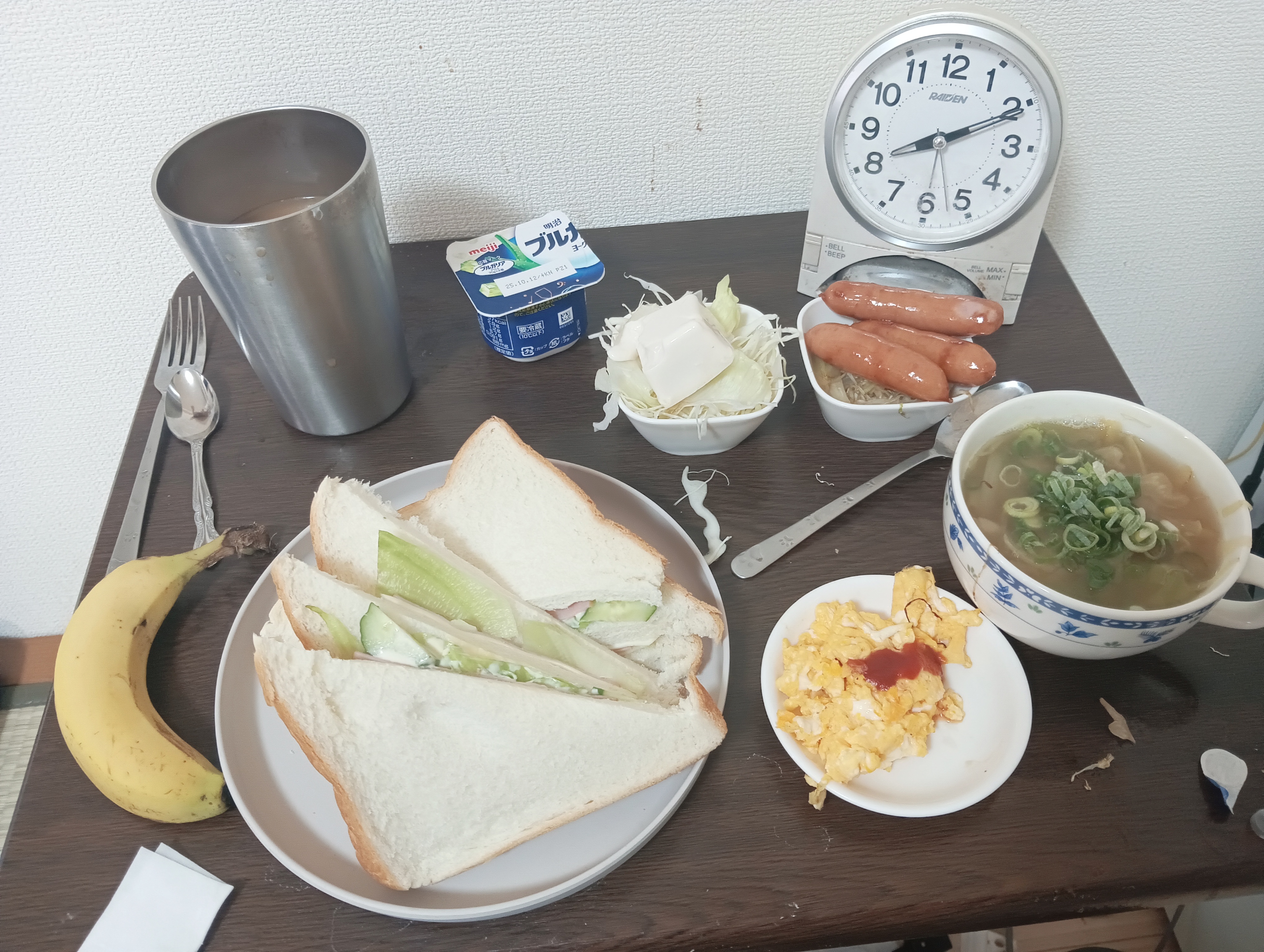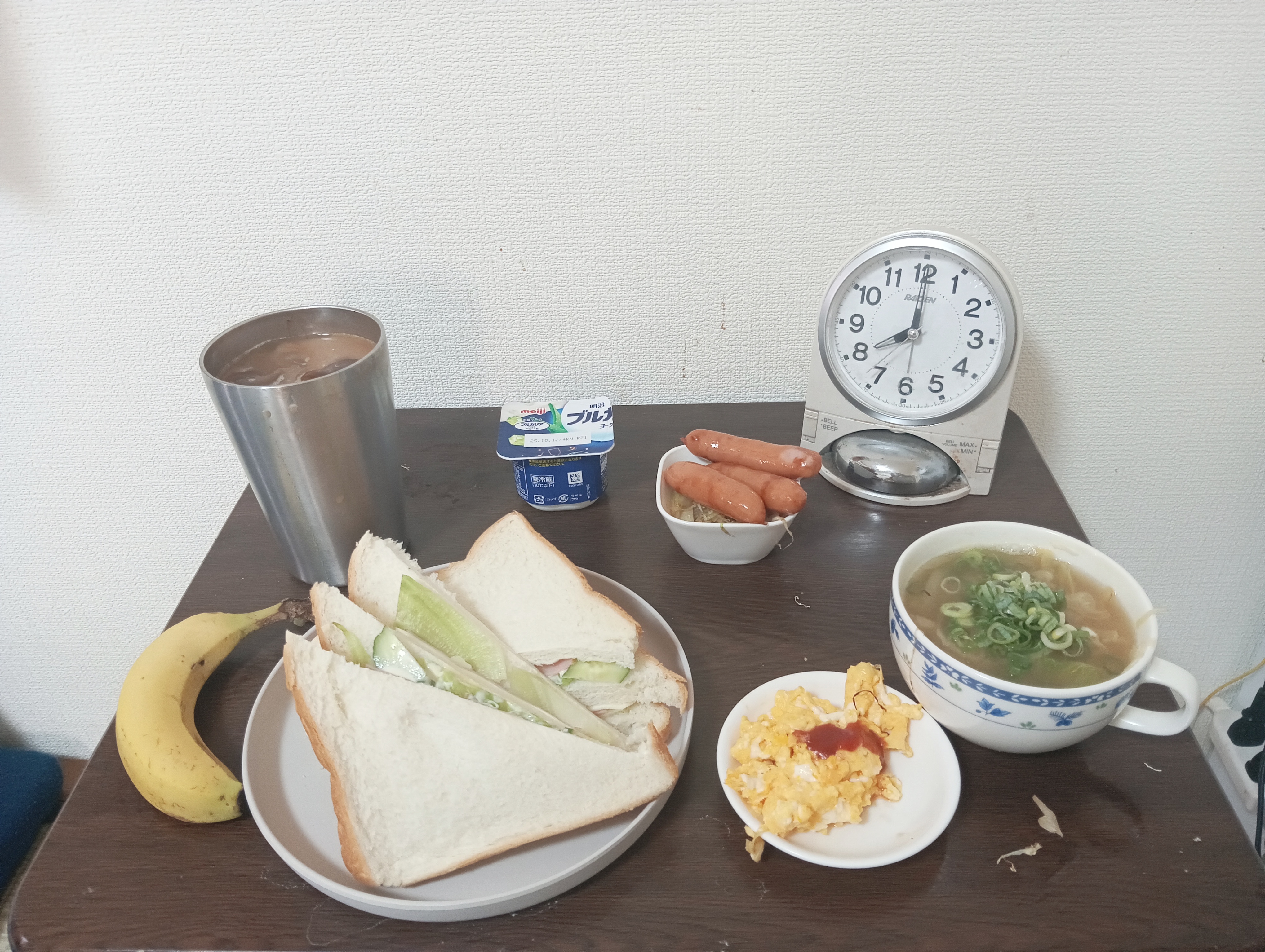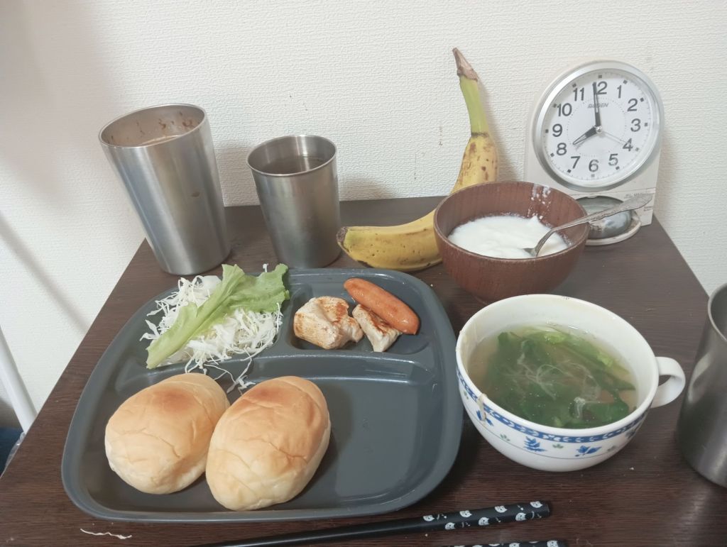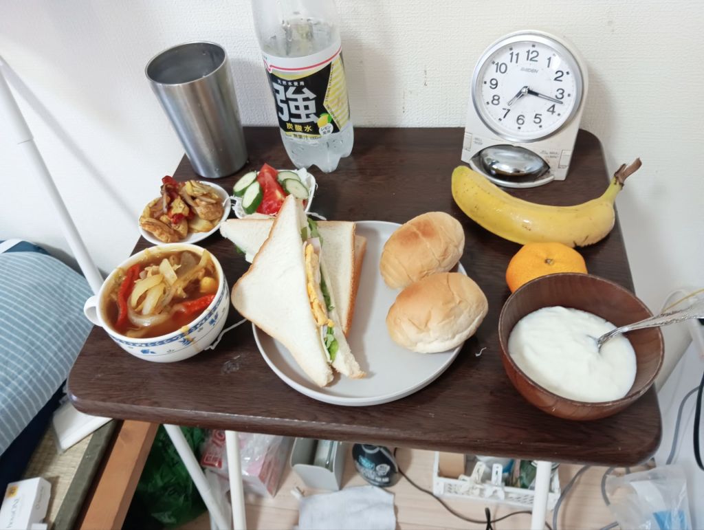 風邪気味と言え、一人暮らしだから当然だけど買い物と自炊体力は一応あるから大丈夫かな??京都の藤原定子と藤原彰子が空から見ているかも?と思えば気合が入る!おにぎりの海苔を星形にしたいけど、どうやってやるんだろ??と思ったけど、、、母はどうやってサッカーボールとかしていたのか?玉子おにぎりをつくっていたのか?とか結構、「テクニック」がいるよな。。。平安時代にも弁当はあったのかな?とか「おむすび」「漬物」「お茶(水筒)」はあったのじゃないのかな??1000年前に弁当があった前提で、現代から1000年前と対峙する感覚で気楽に集中して作ってみた。全部食べなかったら、どうなるか?は・・・無論わかっています。栄養素が難しいけど、ミネラルとか鉄分とかカリウムとかビタミンとか難しいよなぁ・・。バナナと苺ヨーグルトがミソかもしれない。アイスコーヒーも風邪の時軽く飲むのはいいの?水はスーパーの「麦飯石(むぎめしいし?)」があるしこれもミネラルだよね。道楽者?の弁当作り、🗽降臨?ってことかな?