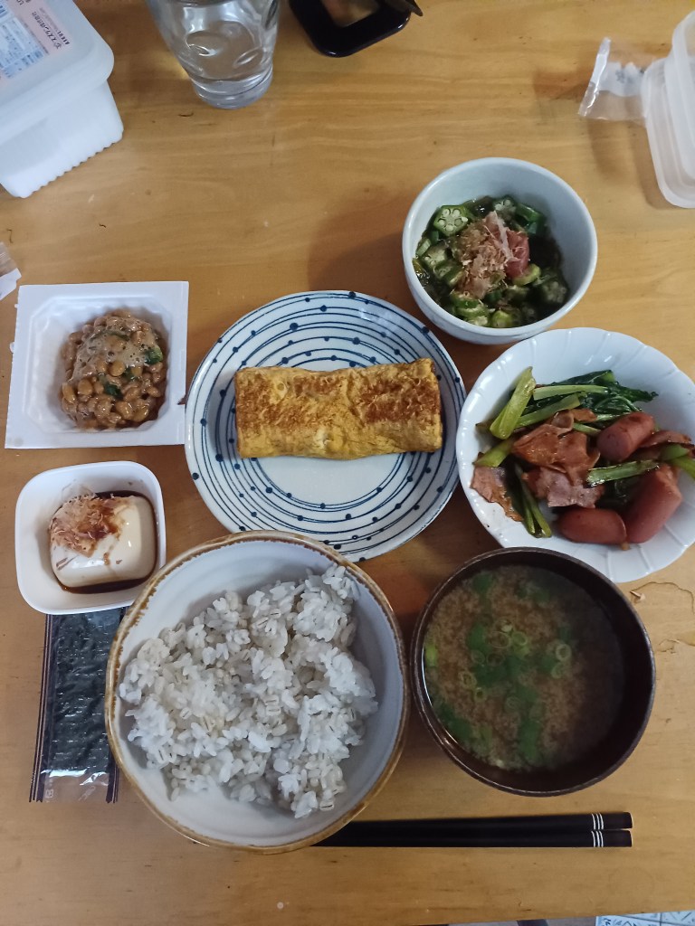 ご飯、味噌汁、玉子焼き、冷奴、納豆、メカブオクラ(梅入り)、ウインナーとベーコンと小松菜のソテー、海苔