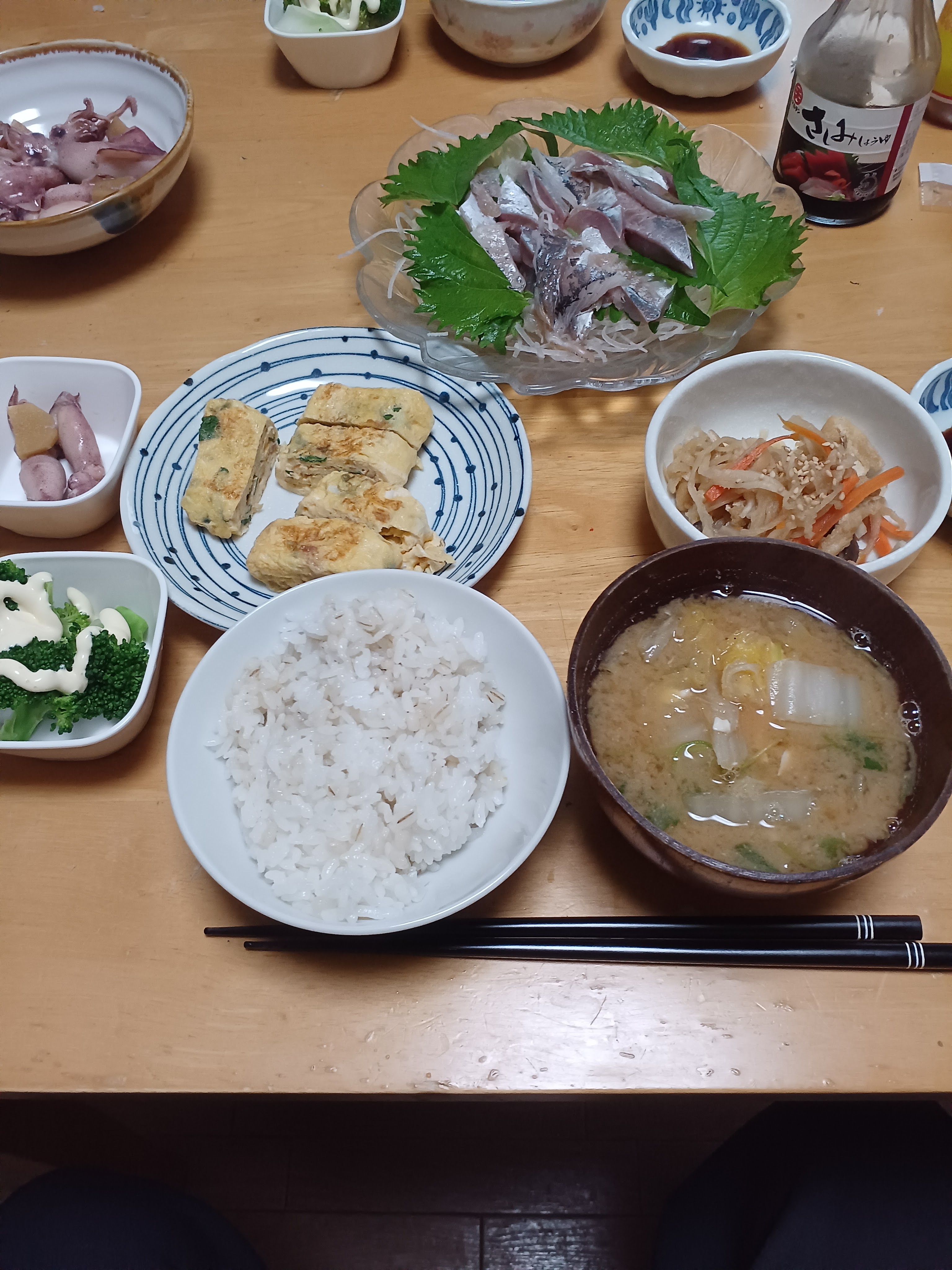 ご飯、味噌汁、アジの刺身、玉子焼き(シソと梅入り)、切り干し大根、イカの甘辛煮、ブロッコリー