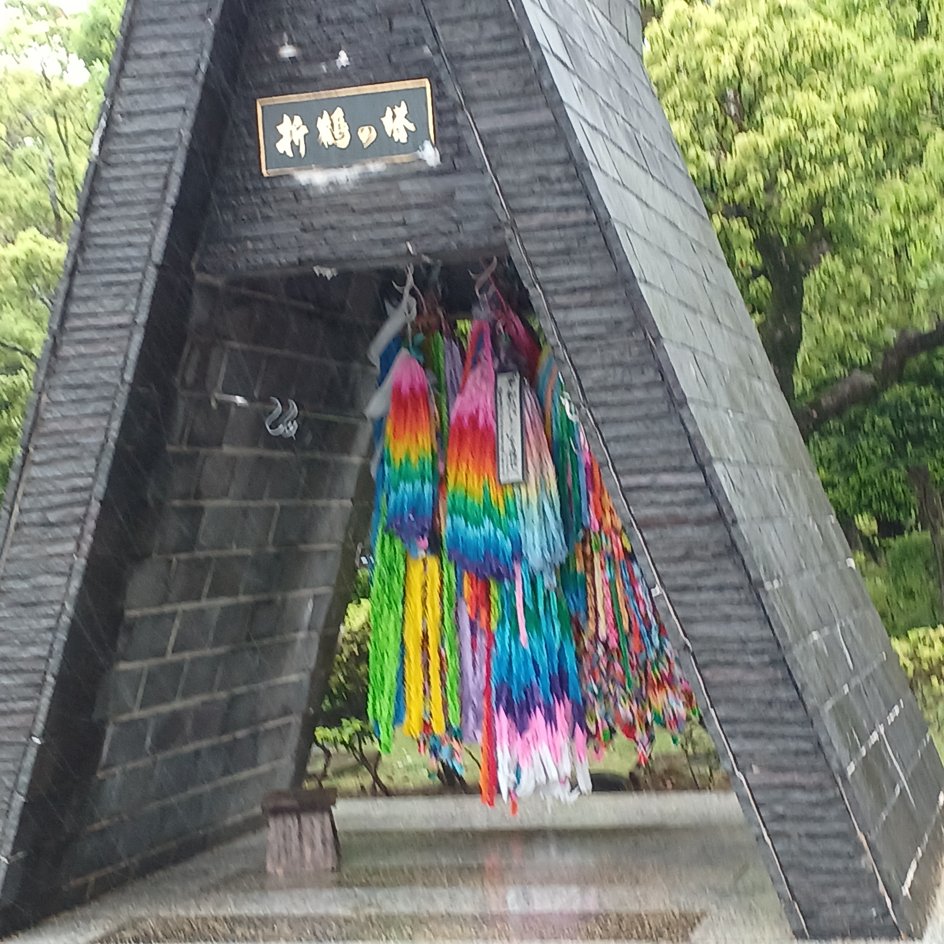 垂直と水平に伸ばした手が特徴の大きな銅像はインパクトがありました。千羽鶴も飾ってありました。綺麗な色に分けられていました。