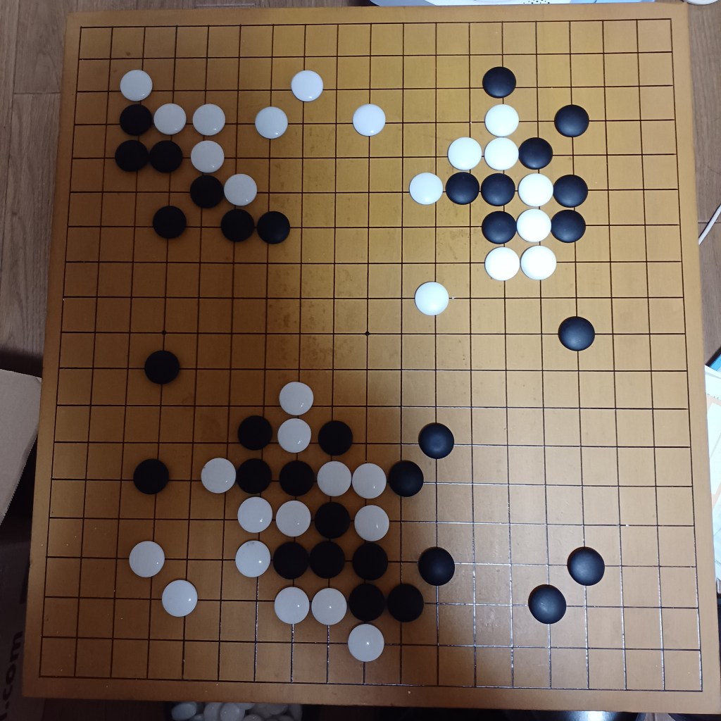 左辺は守りに行ったのですが、今日はここまで。ここから攻めるテクニックを身に着けるため、次は置き石を置いて指導するとのこと。9石くらい置いていいですか?と聞いたら別にいいよ、とのこと。