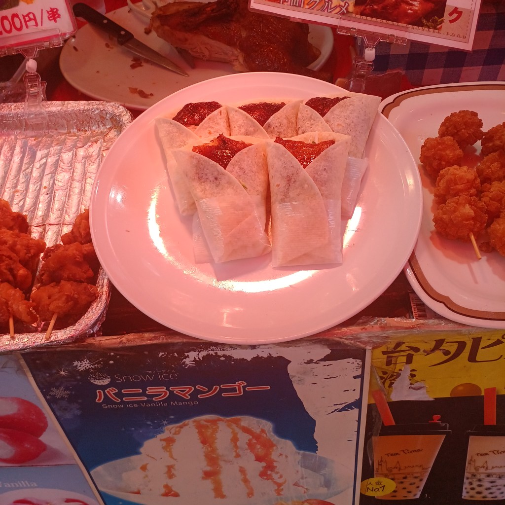 甘いタレのついた皮のついた豚肉の角煮でしょうか?これを薄い生地で包んだ感じの料理でした。一つ400円のを350円にまけてくれました。