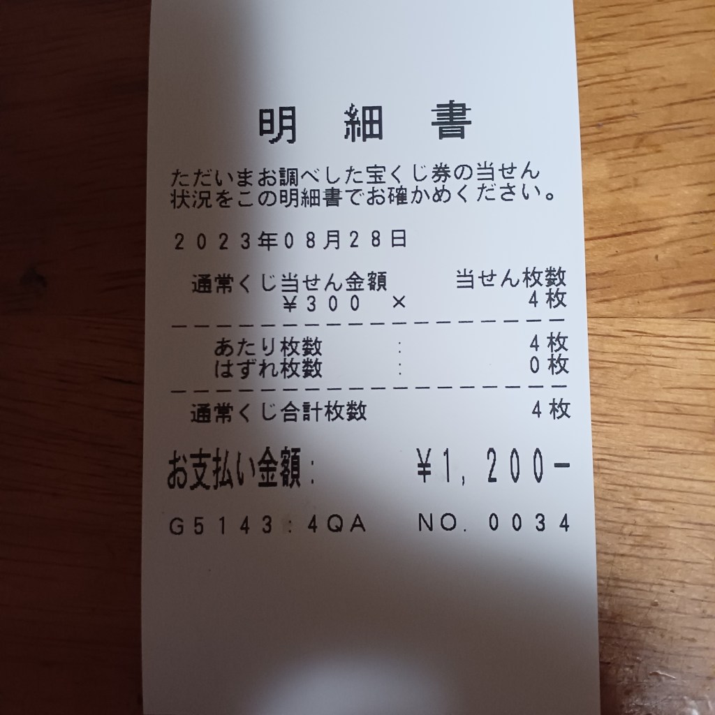 サマージャンボ宝くじ、なんとか300円4枚当たりました。