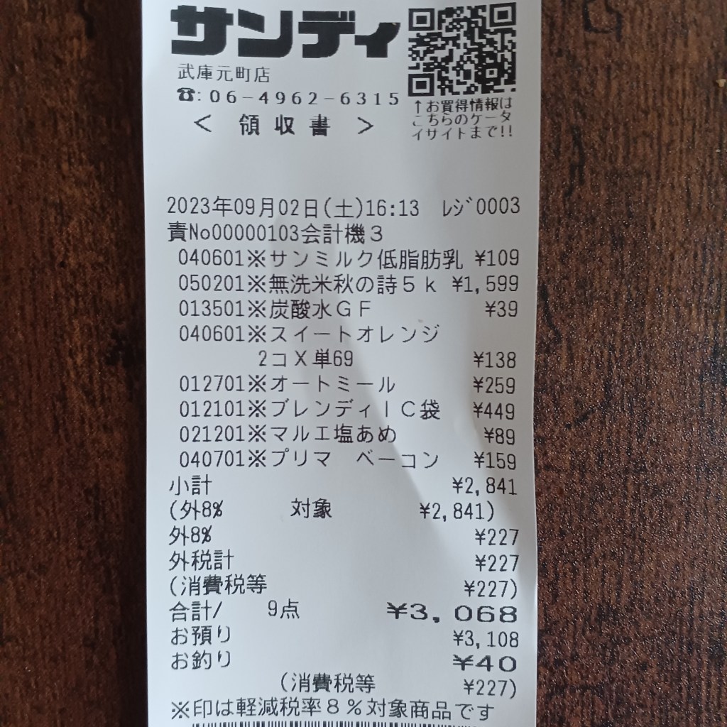 スーパーの食料は「3068円」でした。