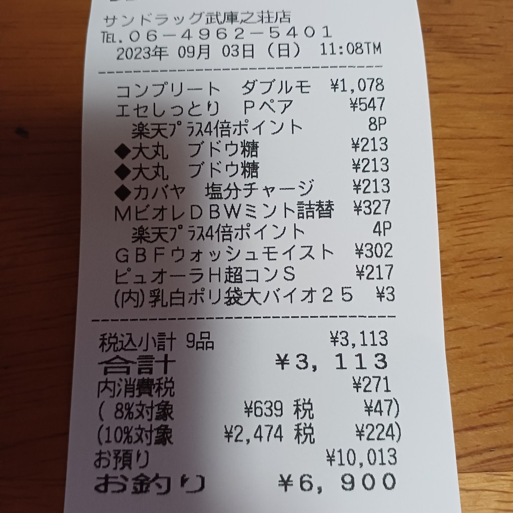 支払いは10013円で払ってお釣り6900円。