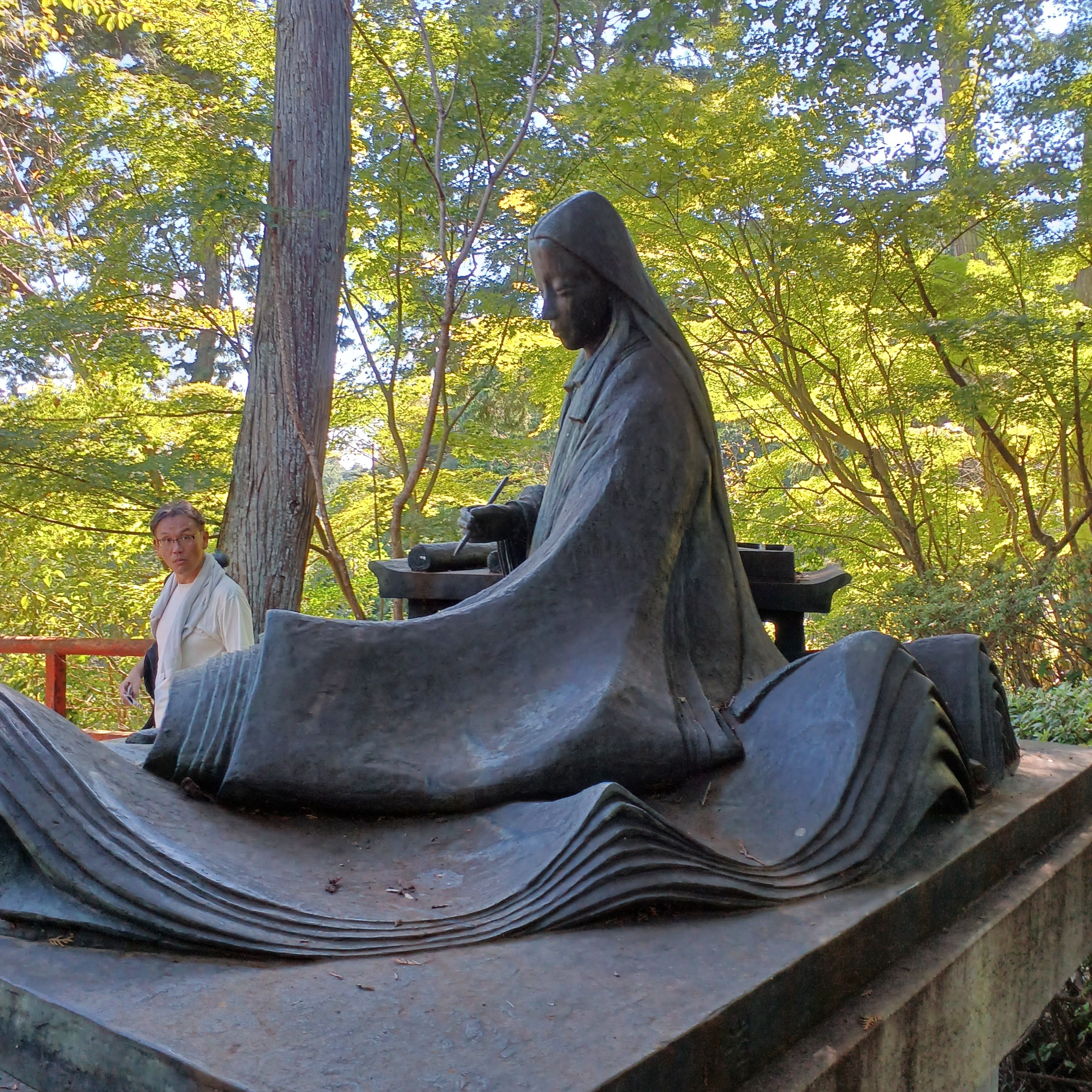滋賀県の「石山寺」(石山駅に紫式部のイラストがあるとのことで取材)に向かい、「紫式部像を」眺めてきました。