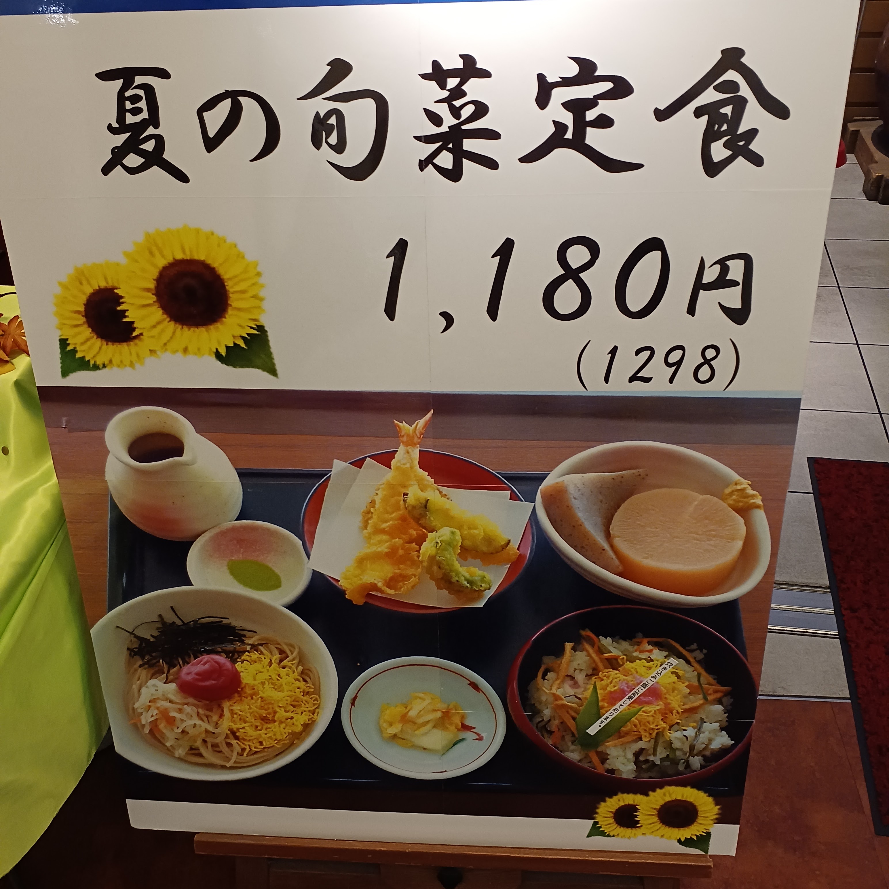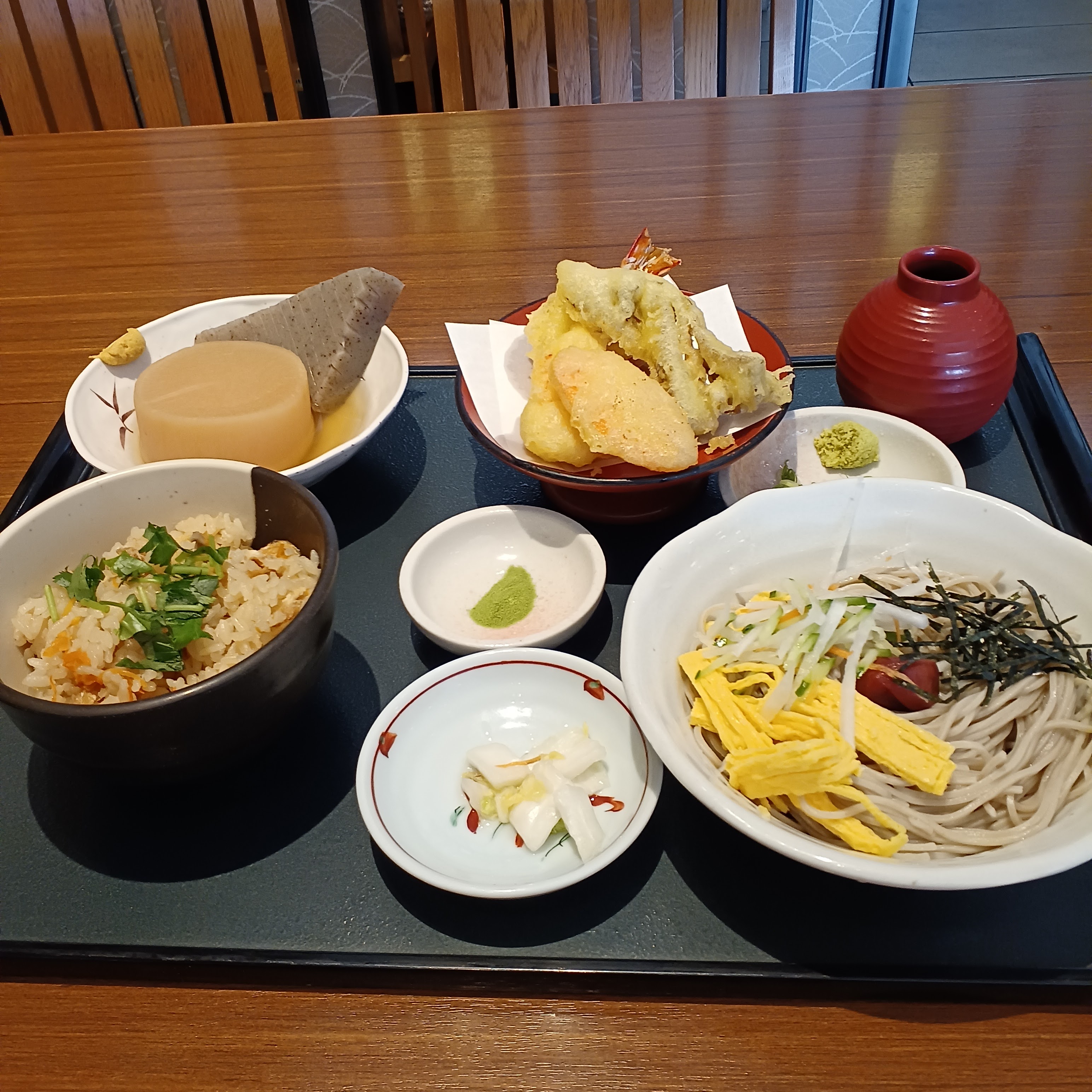 旬菜定食:冷やし蕎麦・炊き込みご飯・天ぷら・おでん(大根・こんにゃく)・漬物のセットメニューで税込み1298円でした。