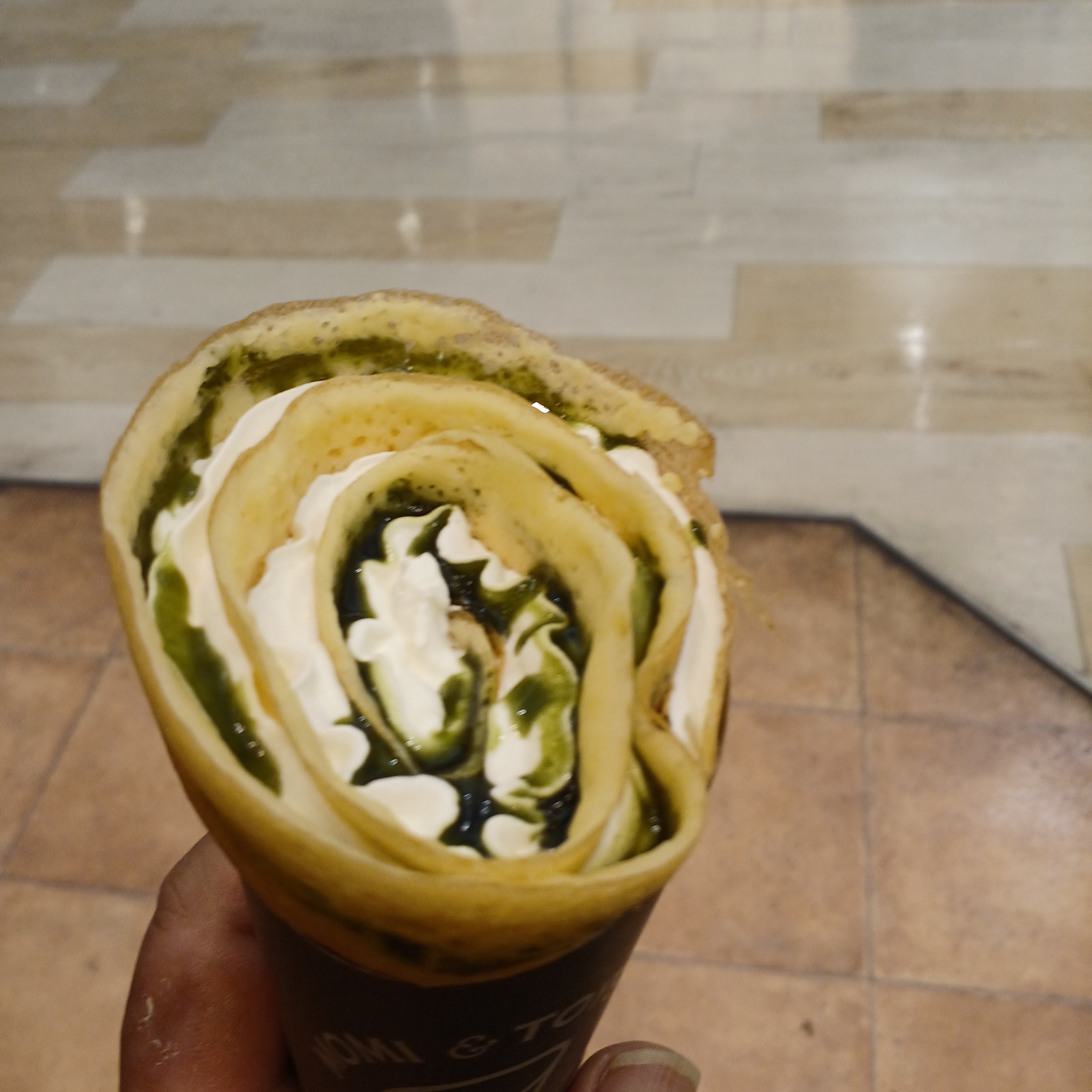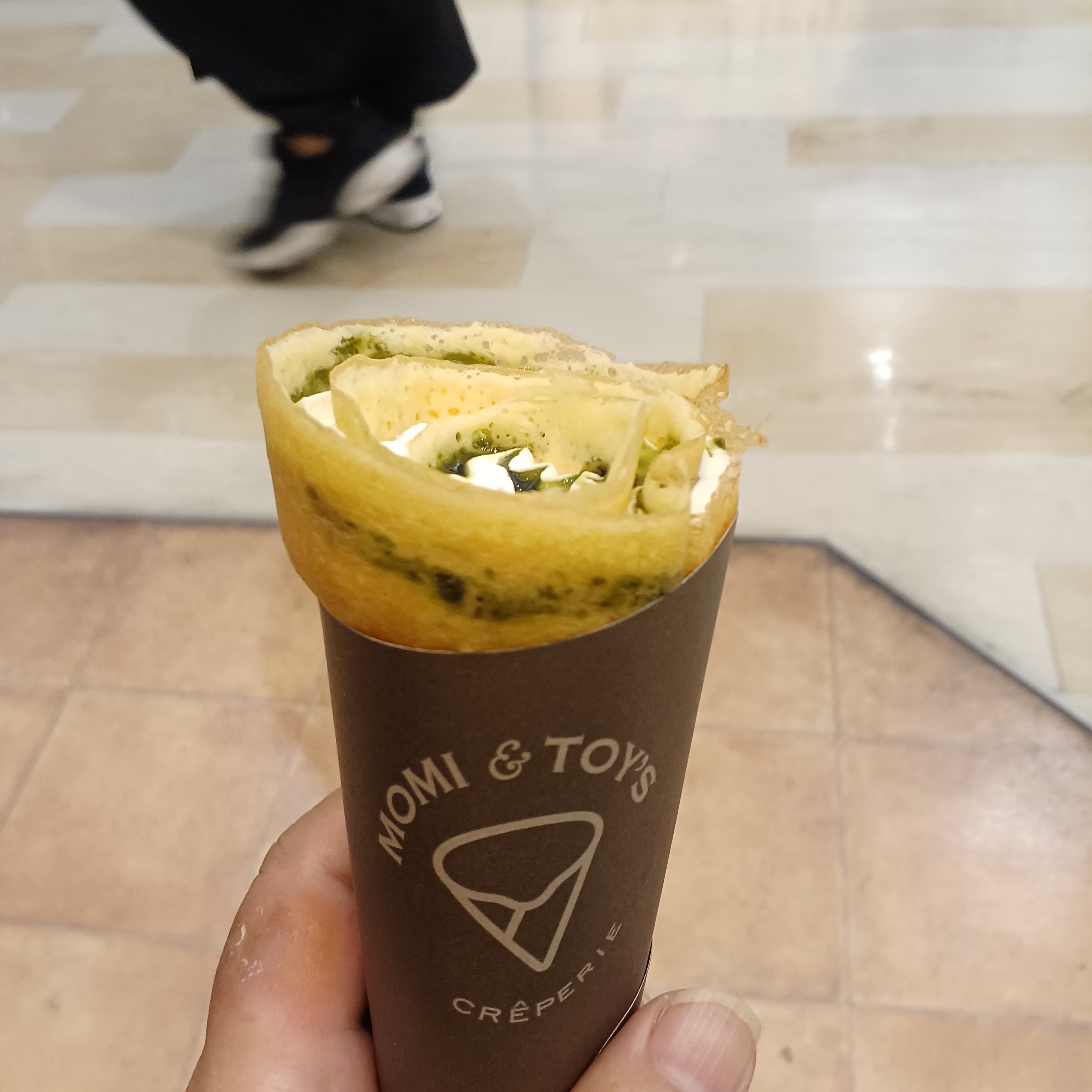 ランチが終わったら女神と話し合っておやつのクレープを食べることにしました。「何がいいですか?」と尋ねたら「抹茶味がいい」と言われたので1個510円の抹茶クレープを食べました。この時は500円玉を使いました。