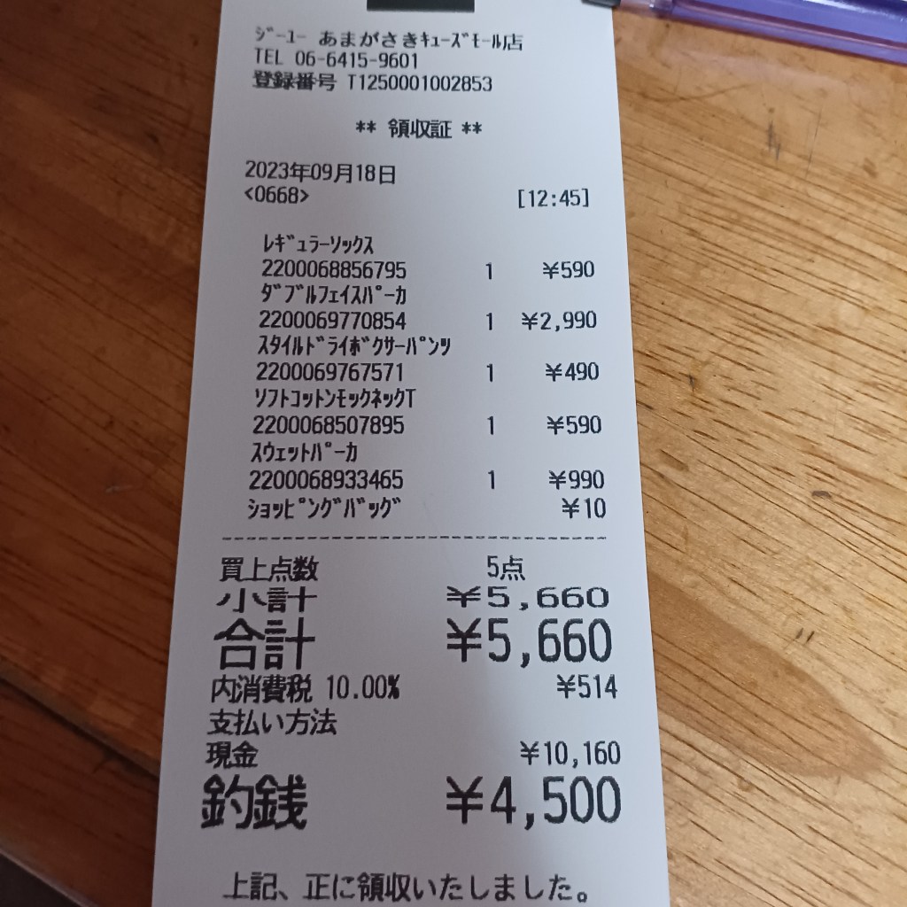 そのあと、GUに寄って秋用のパーカーや靴下などを買いました。コスパがいいのか3つ服を買って5660円でした。1万円札と小銭で支払って、この時は「500円玉」のお釣りをゲットしました。1万円札で1つ高い服をブランド店で買おうか考えたのですが、男だから(?)誰も気にしてないしGUを選択しました。なんか家に戻ってから「保育士さんが着る服みたいなばっかじゃない??」って女神に言われているのですが、・・・次は高級ブランドの服を選べってこと??(女神は倹約家?節約家?時による?)