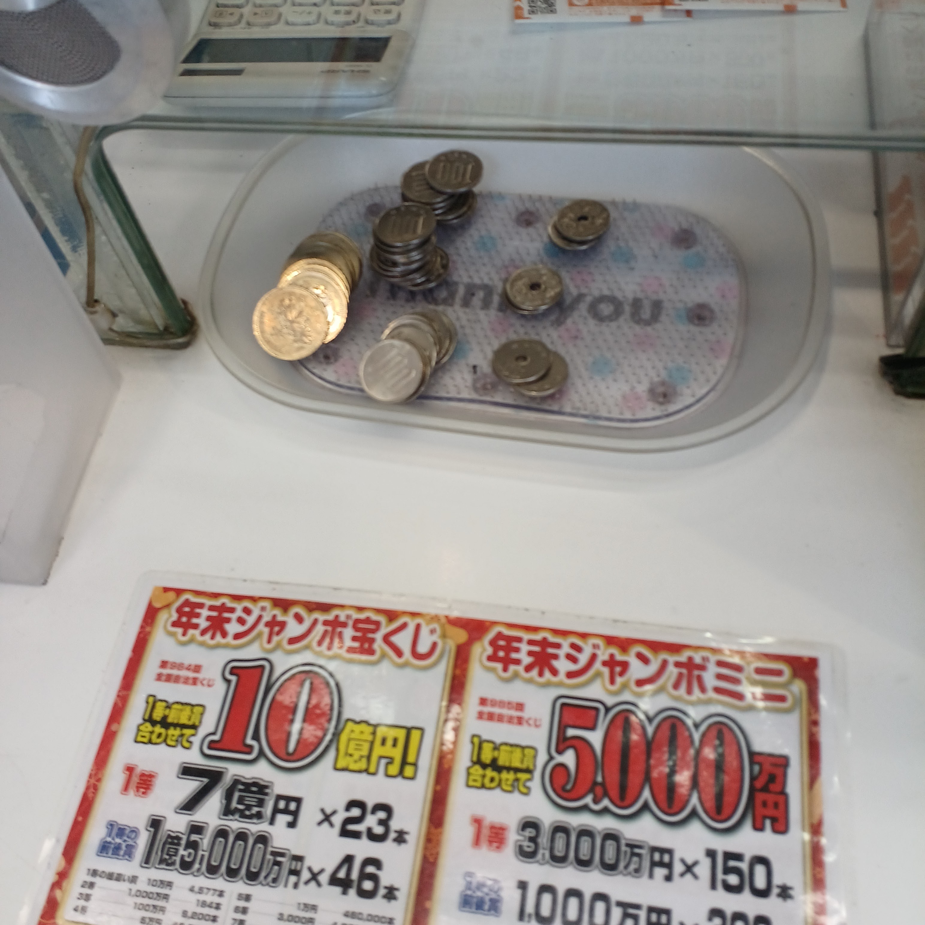 結局、1日の4回の支払いで小銭を循環リサイクルして財布の中の小銭をできるだけクリーンアップ(掃除?整理整頓?というか)してから宝くじを「500円玉9枚・100円玉27枚・50円玉6枚」の計7500円で25枚購入しました!