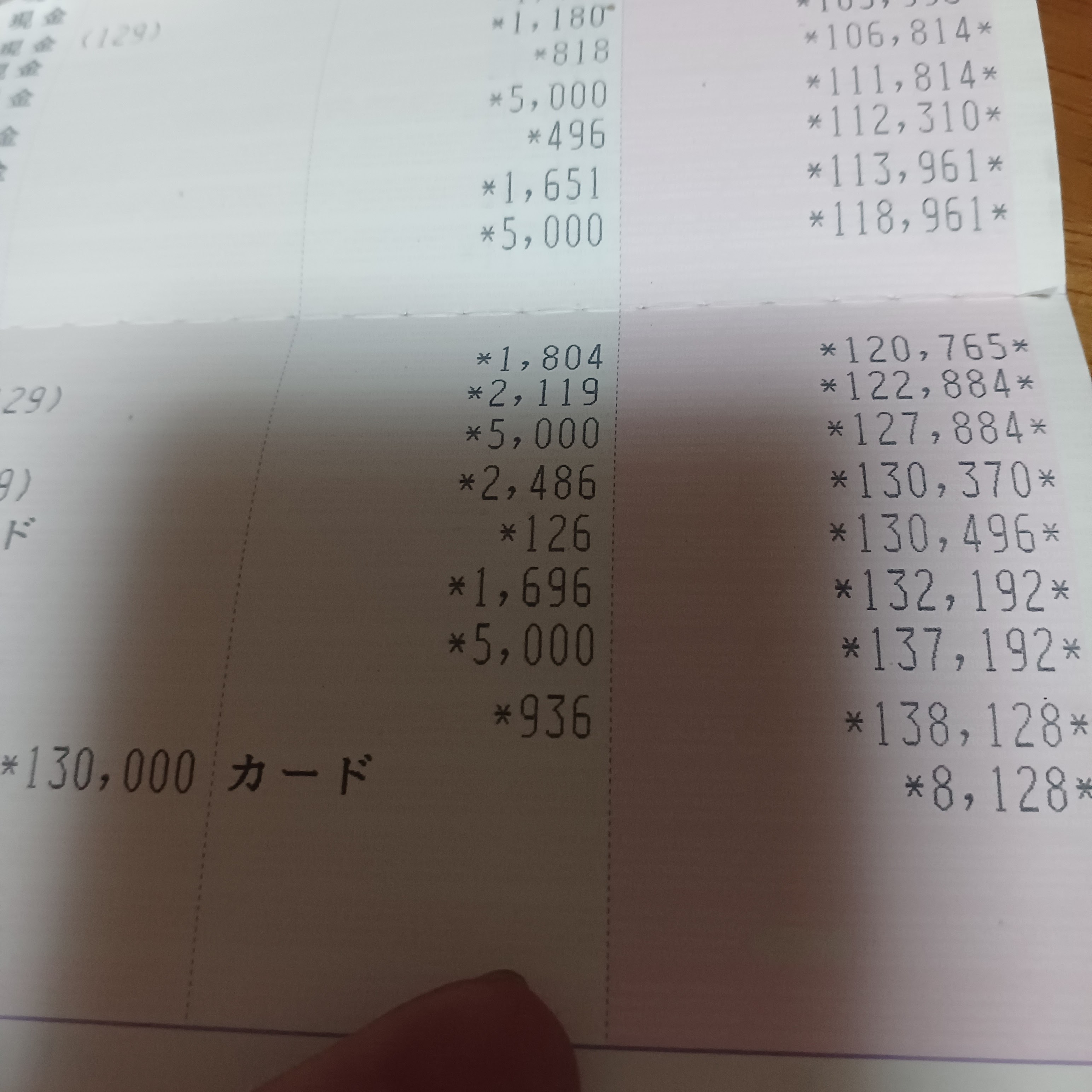 「予備ATM通帳残高」が先週「130496円」と完全数「496」が残ったので少しビビったのですが、どうもこの不思議な感覚が消えなかったので、今日はあえて「完全数」を作ったというかついてくるような跡を残して行動してみました。