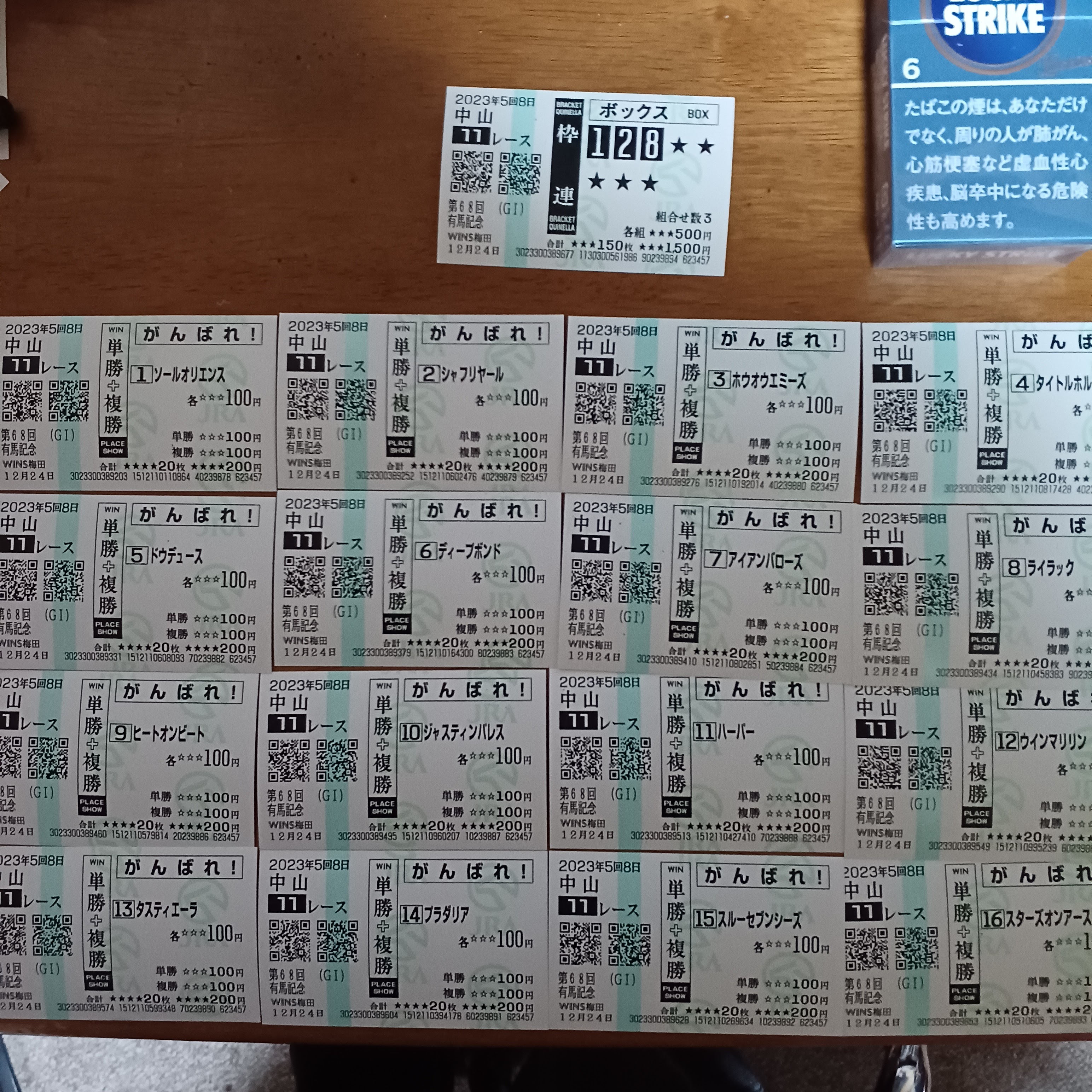僕は、去年の有馬記念で、「無事是名馬」を祈願して単勝・複勝の16枚を全部買ってみたのですが、これなら絶対に「単勝」1つと「複勝」3つが当たるので、なかなかワクワク感が出るウェルフェアな勝馬投票券だと思って、今年もこれで少しだけ買って観ようかと思います。