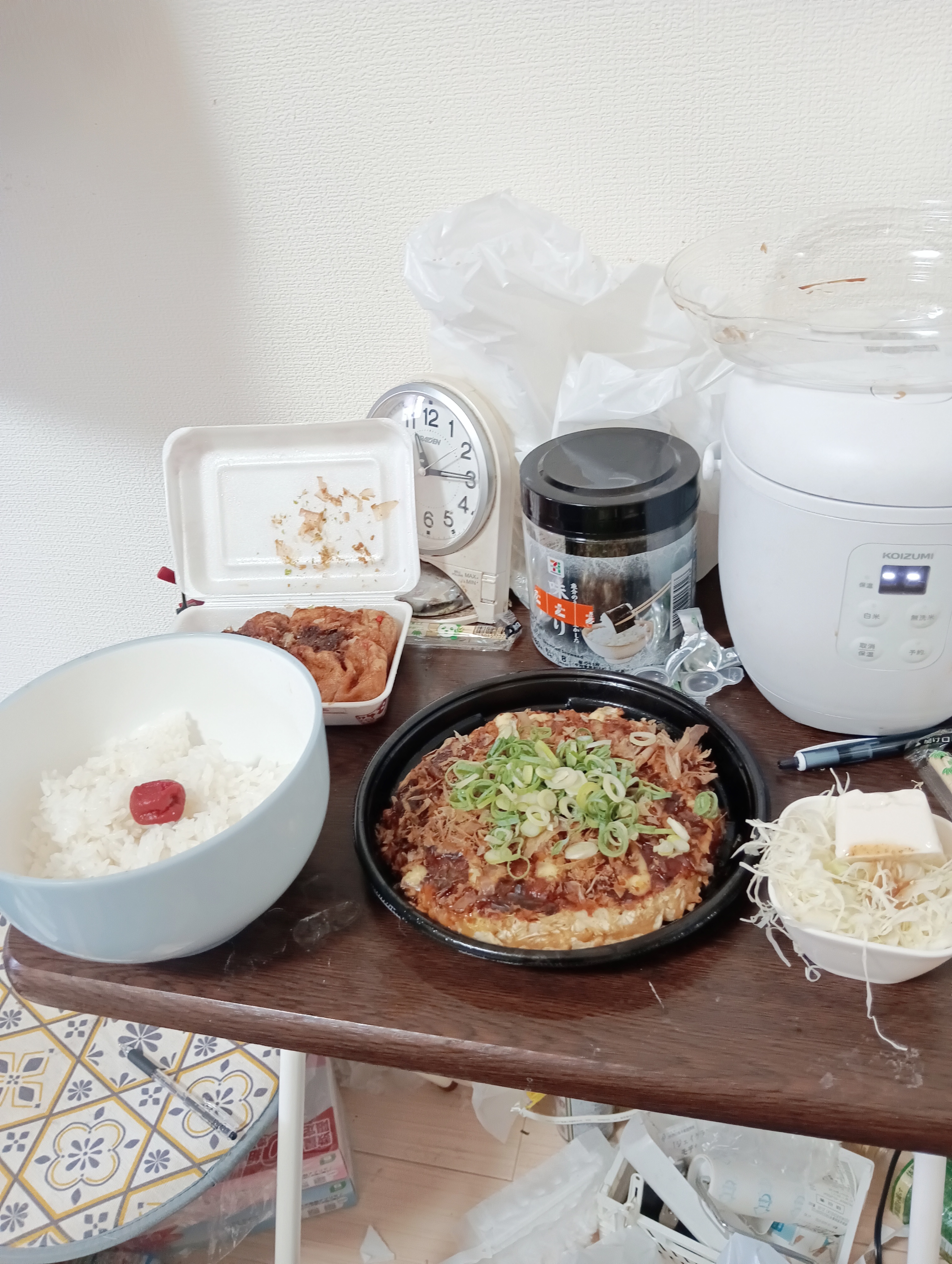 一旦家に帰って早速、食べてみました。人生初めて「お昼にご飯を自炊して.お好み焼きとたこ焼きを昼食に食べた」かもしれない。。。